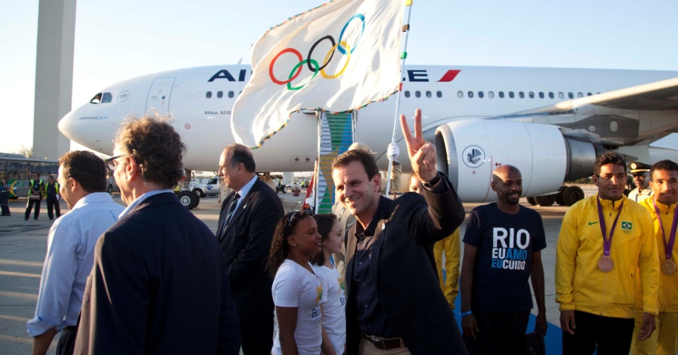 Na ocasião, Paes desembarcou na capital fluminense junto com atletas que representaram o país em Londres e ao lado do presidente do Comitê Olímpico Brasileiro, Carlos Arthur Nuzman. Na saída da aeronave, o candidato do PMDB exibiu a bandeira olímpica, fato que foi registrado por jornalistas nacionais e estrangeiros.